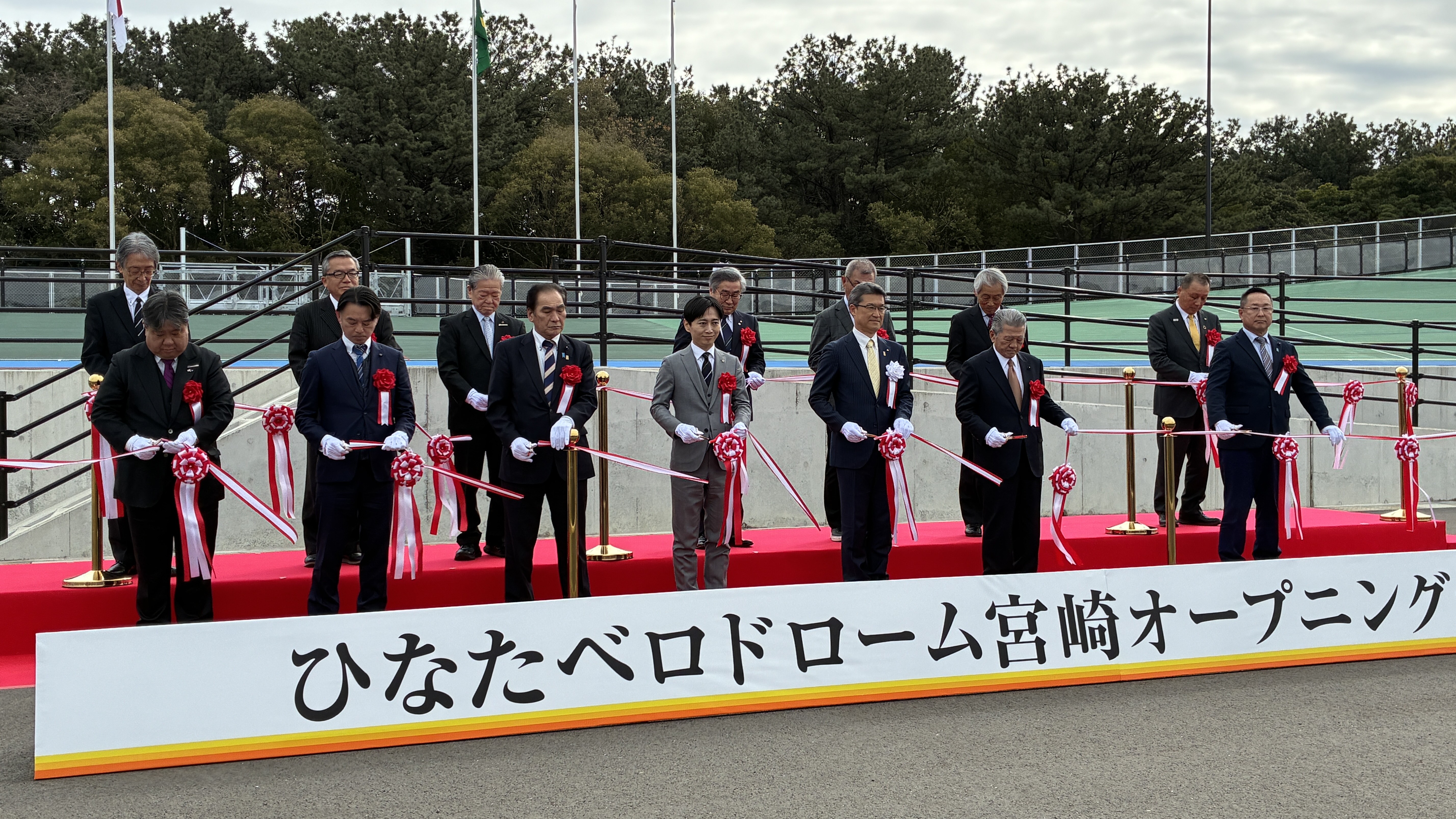 本日、晴天のもと、ひなたベロドローム宮崎のオープニングセレモニーが行われました。施工者の一代表者として、そのセレモニーに出席してまいりました。 当社は、インフィールド舗装工事と、外周道路及び駐車場舗装工事を施工させて頂きました。ご協力いただいた関係者の皆さん方にも感謝です。 本日の式典は下記の通りです。 ➀主催者あいさつ(宮崎県知事) ➁来賓あいさつ (宮崎県議会議長) ③来賓あいさつ (宮崎市長) ④来賓あいさつ (宮崎県自転車競技連盟会長) ⑤ネーミングライツ授与式 ⑥ゲスト挨拶 (日本自転車競技連盟副会長/中野浩一) ⑦テープカット