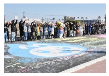 現在、当社が施工している、宮崎駅東通線ですが、3月7日に全線開通いたします。 現在最後の追い込み作業中ですが、昨日は地元の小学生90人が現場に来て、出来たばかりの道路の上に宮崎市のキャラクター『みやねこ』に色を塗るイベントが行われ、当社もお手伝いをさせて頂きました。